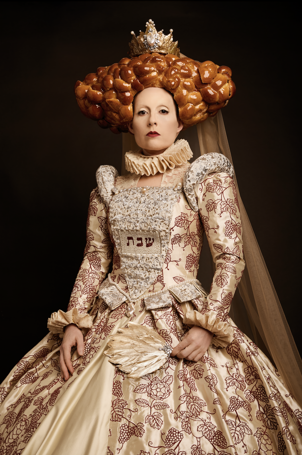 For Sabbath Queen, Durchslag employs Queen Elizabeth I of England’s aesthetics to depict Judaism’s most famous female monarch - the invisible, holy entity whose weekly Sabbath visits every Friday begin the holiday. In Durchslag’s interpretation, this figure embodies conservative Jewish political power, Zionism, and empire. She's a haughty, superior, judgmental, and lethally confident sovereign.